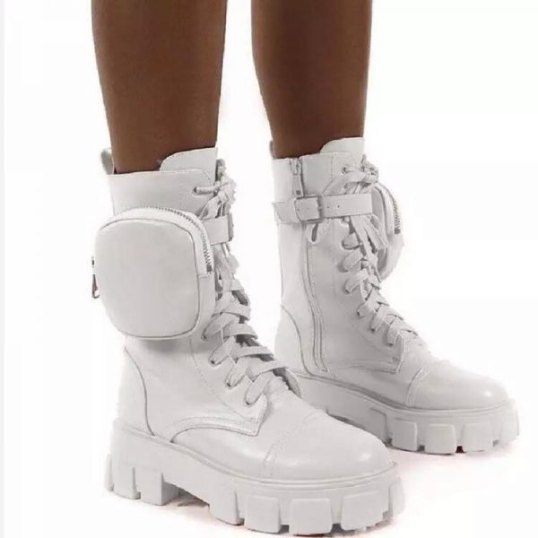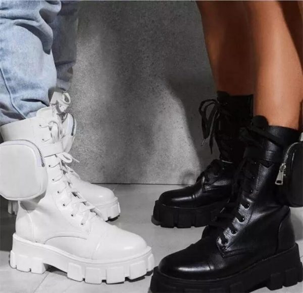 Women’s Pocket Platform Motorcycle Boot Winter Women Leather Boot Woman Lace Up Ladies Low Heel Female Shoe Plus Size